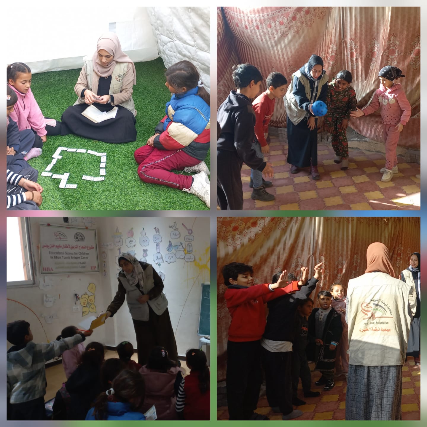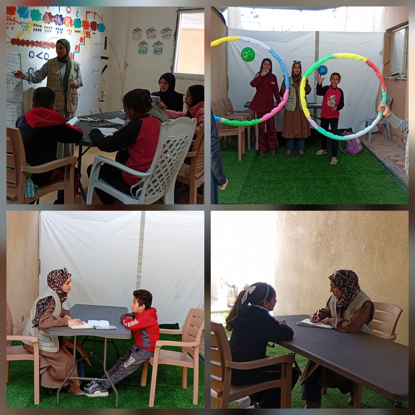 Des jeux collectifs et des compétitions été organisés dans les locaux. Des activités récréatives ont été mises en place dans des « écoles refuges » en collaboration avec les administrations scolaires. Ces activités avaient pour objectif de renforcer chez les enfants le travail d’équipe et d’acquérir des émotions positives. Elles ont été menées par Yasmeen, Alaa, Ola et Hani, avec l’aide du reste de l’équipe d’animatrices.