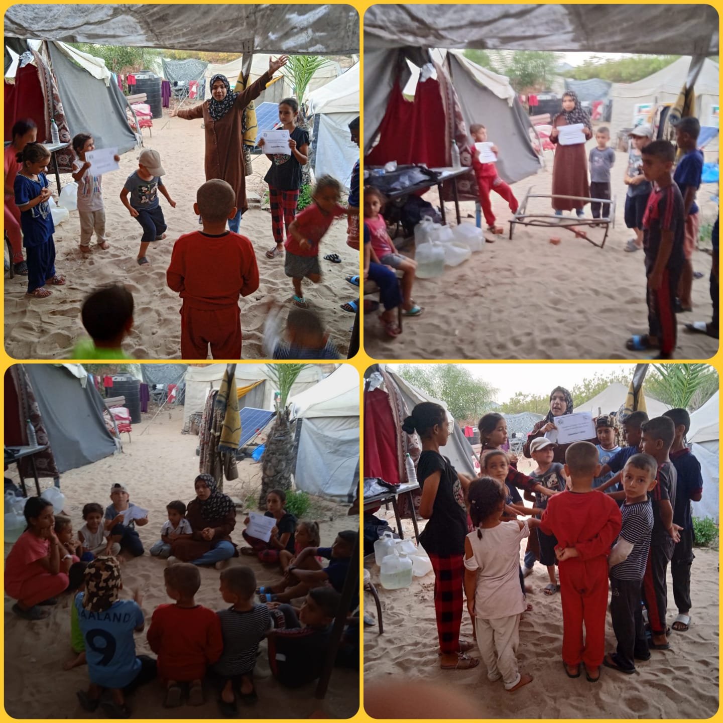 En coordination avec l’administration du Camp Al-Attar d’Al-Mawasi, et suite à leur demande, des activités récréatives ont été mises en place pour les enfants et leurs familles. L’équipe a été remerciée pour cette collaboration.