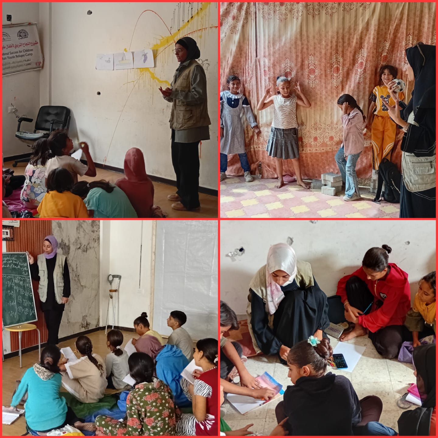 Les activités menées comprennent l’enseignement artistique, le soutien psychologique, des jeux et des activités scolaires.