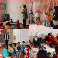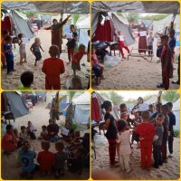 L’équipe continue à travailler avec les enfants, résidents du Camp et déplacés, de nombreuses familles déplacées n’ayant pas pu retourner à leurs domiciles complètement détruits.